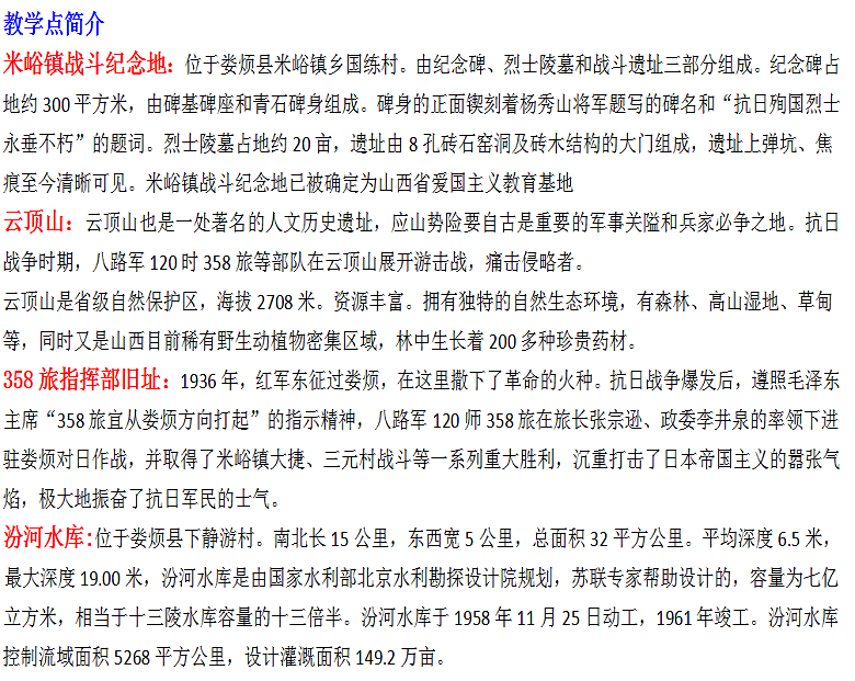米峪镇战斗纪念地、云顶山、120师358旅指挥部旧址、汾河水库