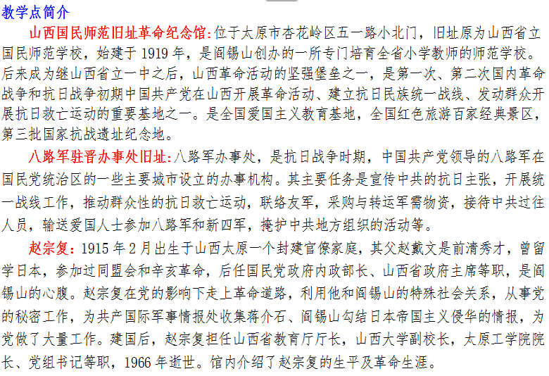 山西国民师范旧址纪念馆、八路军驻晋办、赵宗复纪念馆一日