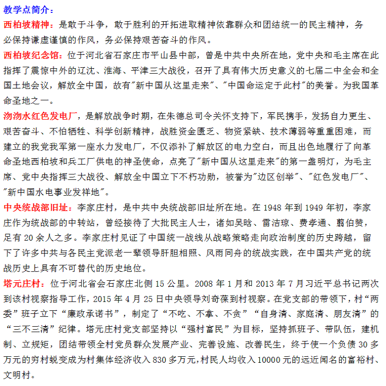 西柏坡纪念馆、沕沕水红色发电站、统战部旧址、塔元庄二日