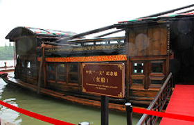 红船:嘉兴南湖中共“一大”会址位于浙江省嘉兴市区东南南湖路西侧。1921年7月底,中国共 产党第 一次全国代表大会由上海转移到嘉兴南湖一艘画舫上继续举行并闭幕,庄严宣告了中国共 产党的诞生。这艘画舫因而获得了一个永载中国革命史册的名字——红船,成为中国革命源头的象征。南湖革命纪念馆:位于嘉兴市南湖区烟雨路七一广场。南湖革命纪念馆成立于1959年10月,1960年在党中央和浙江省委的直接关怀下,南湖革命纪念馆成立了。是嘉兴南湖中共一大会址的宣传、保护、管理机构,属于近现代纪念性专题纪念馆,隶属中共嘉兴市委宣传部。1985年邓小平同志亲笔题写馆名,是全国廉政 教育基、浙江省党史教育基地。这是一座既有民族风格又有时代精神的现代建筑。主体建筑为中国共 产党党徽造型,馆内设置基本陈列《开天辟地大事变——中国共 产党第 一次全国代表大会史料陈列》等。