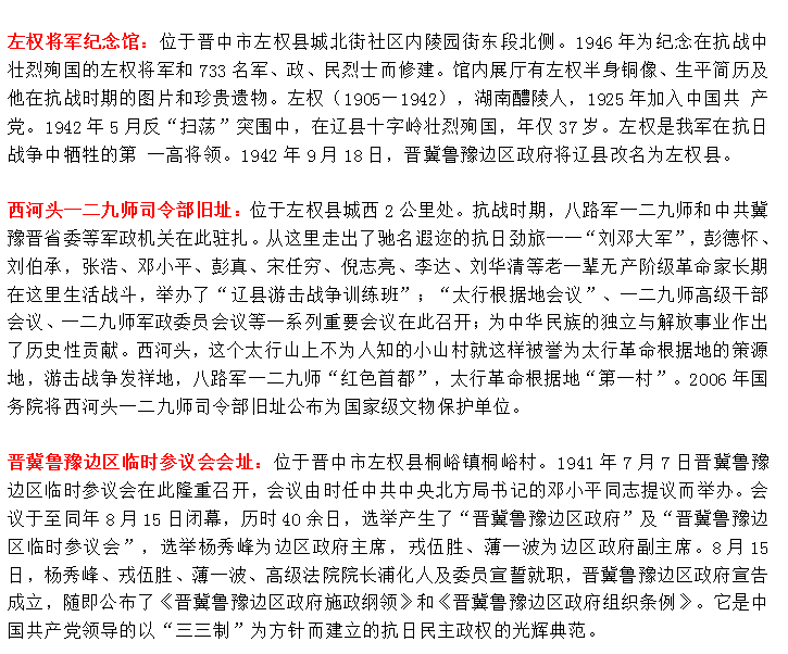 武乡太行纪念馆、砖壁旧址、王家峪旧址、左权麻田八路军总部纪念馆二日