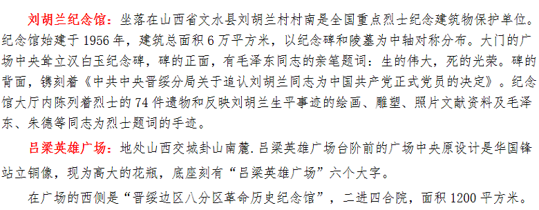 晋绥纪念馆、四.八烈士纪念馆、西北局旧址毛泽东东渡黄河纪念碑、中央后委驻临县陈列馆、于成龙廉政文化园、刘胡兰纪念馆三日